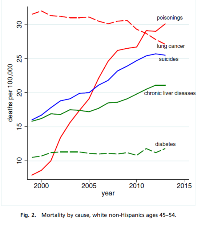 Case and Deaton point to three main causes of this increase in deaths: poisonings from drug overdoses, deaths from liver diseases (likely related to alcoholism), and suicides. The Commonwealth Fund found that the lack of progress in several leading causes of death such as heart disease was also a major factor. This is highly reminiscent of Russia in the 1990s, when rising deaths from heart disease were attributed to increased economic stress because no other risk factors appear to have changed.